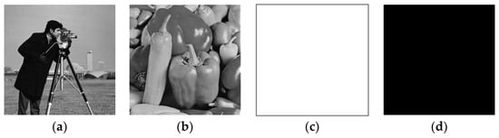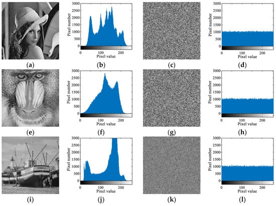To check the validity of the proposed image encryption algorithm, we carried out simulation experiments with several standard test images, such as lena, cameraman, mandrill, peppers and boat that were obtained from the CVG-UGR image database (https://ccia.ugr.es/cvg/dbimagenes/ (accessed on 3 February 2022)), and other test images that were obtained from the miscellaneous volume of USC-SIPI image database. The USC-SIPI image database is available and maintained by the University of Southern California Signal and Image Processing Institute (http://sipi.usc.edu/database/ (accessed on 3 February 2022)). The secret key parameters of the cryptosystem were (x0, y0, z0, u). The simulation was carried out on the Matlab R2021b platform running on a computer with Intel Core i7-9700 @ 3.00GHz processor, 16 GB memory and Windows 10 operating system. In our simulation tests, the secret key parameters {x0, y0, z0} were generated with the plaintext image to be encrypted, and u was set as 5.167.