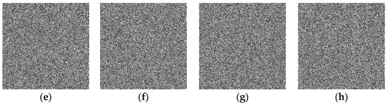 The standard test images and their encrypted ones. (a) The plaintext image cameraman. (b) The plaintext image peppers. (c) The plaintext all-white image. (d) The plaintext all-black image. (e) The encrypted image cameraman. (f) The encrypted image peppers. (g) The encrypted all-white image. (h) The encrypted all-black image.
