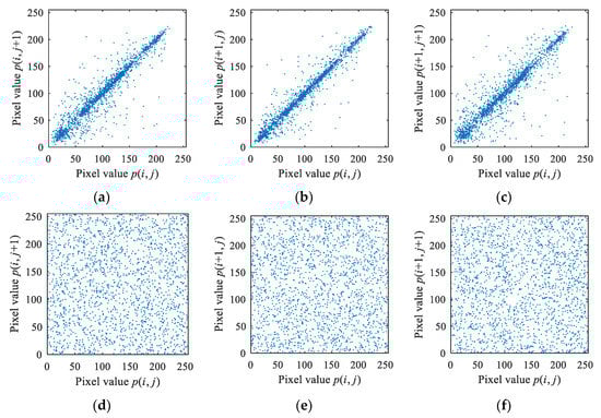 Horizontal, vertical, and diagonal correlation point diagrams of plaintext image Peppers and encrypted image Peppers. (a) Original Peppers horizontal; (b) Original Peppers vertical; (c) Original Peppers diagonal; (d) Encrypted Peppers horizontal; (e) Encrypted Peppers vertical; adn (f) Encrypted Peppers diagonal.