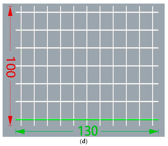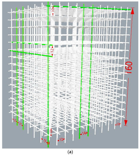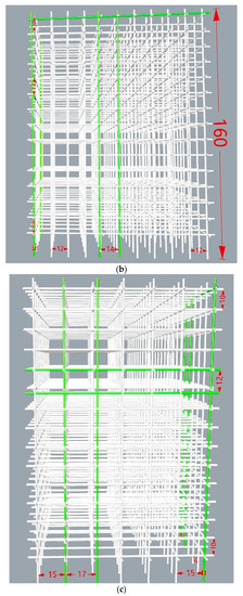 The model set is a length 1.3 m × width 1.0 m × height 1.6 m formwork, consisting of steel vertical poles and horizontal tubes. The model set contains 77 standard poles and 270 tubes. The steel bars are connected via couplers, the longitudinal spacing of vertical pole is set as 12 cm, the transverse spacing of pole is 15 cm, and the lift height (the distance between two neighbouring tubes) is 10 cm. The simulated defects were purposefully set including: the leftmost longitudinal pole is not vertical to the ground but inclined 1 degree; the first top longitudinal tube is not parallel to the ground and is inclined 1 degree; the distance between the 5th and 6th longitudinal poles on the front side is 14 cm; the distance between the 5th and 6th transverse poles on the leftmost side is 17 cm; and the space between the 10th and 11th transverse tubes on the leftmost side is 12 cm. The details of the formwork dimensions are shown in Figure 2.