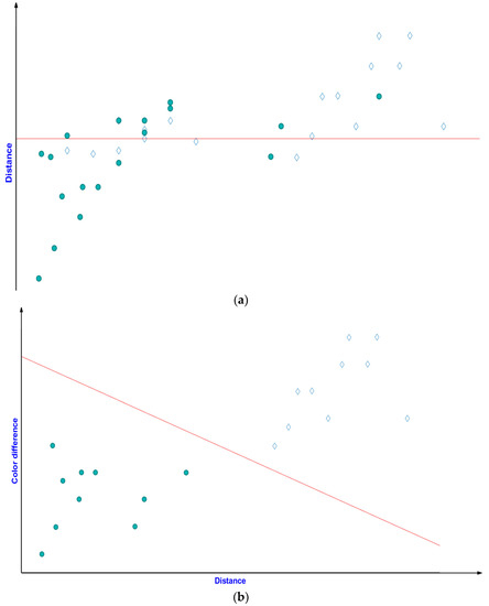 Based on distance value and colour difference, a discriminant analysis can be conducted to classify the valid data and mixed pixels clearly, as shown in Figure 4. The irrelevant data can be removed from the scan data. This step aims to retain data associated with standard poles and ledgers and remove other scan data as outliers. The proposed method is expected to generate more reliable results than conventional methods.