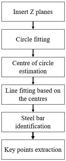 As the high formwork mainly composed of vertical cylindrical poles and horizontal cylindrical tubes, upright poles and horizontal tubes have distinctive geometries and positions that differ from other objects. Hence, both geometries and positions of the scan points were used for classification. The proposed data extract method consists of six steps, as shown in Figure 5.