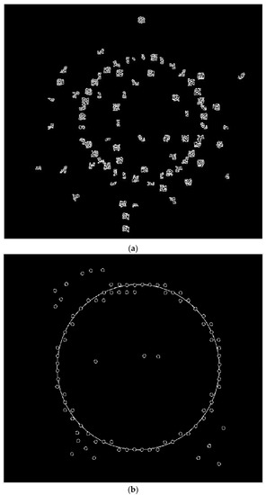 Since a vertical pole is circular in section, the data in every Z plane were clustered in a circle. The region growing algorithm [61] was used to add more points to the points clusters within a certain radius (the radius of a pole). The algorithm iteratively explores the point clusters and adds more neighbor points to the clusters in order to form a circular shape with a certain radius until all the points clusters in the array of Z planes have been checked. If a point does not belong to any of the clusters, it can be seen as an outlier to be removed. The remaining data in every Z plane were corrected in MATLAB by fitting a simple circle based on the section formation of a standard pole. Based on the points the boundary of the poles and tubes can be detected. The centre and diameter of a pole are then fitted according to the detected boundary, as shown in Figure 8. As the same pole has the similar XY coordinates, Equation (2) was used to evaluate whether the point belong to the pole or not.
