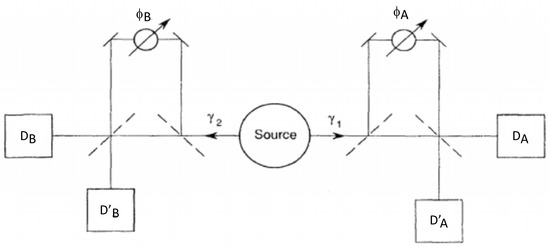 - Clauser, J.F.; Horne, M.A.; Shimony, A.; Holt, R.A. Proposed experiment to test local hidden variables theories. Phys. Rev. Lett. 1969, 23, 880–884. [Google Scholar] [CrossRef] [Green Version]