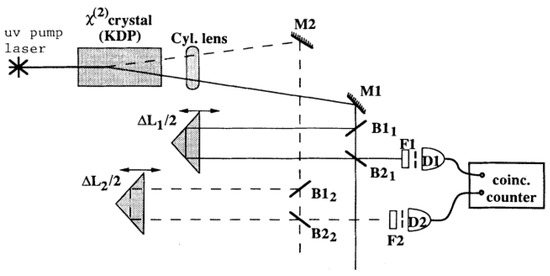 - Kwiat, P.G.; Vareka, W.A.; Hong, C.K.; Nathel, H.; Chiao, R.Y. Correlated two-photon interference in a dual-beam Michelson interferometer. Phys. Rev. A 1990, 41, 2910. [Google Scholar] [CrossRef] [PubMed]