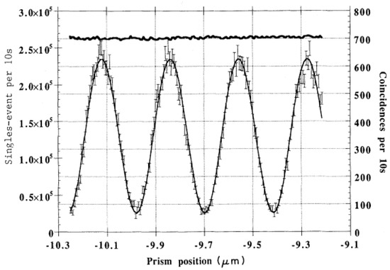 The other half corresponds to pairs for which both photons are detected simultaneously. If they are detected either by detectors and or by detectors and , they are counted as event . On the other hand, if they are detected either by detectors and or by detectors and , they are counted as event . As shown in Figure 3, which has been taken and reproduced here from reference [17], these events occur with probabilities that show a characteristic pattern of interference fringes as a function of the length difference introduced in the experimental setting (9), even though the total number of photons collected at each one of the four detectors do not show any such fringes, which is in good agreement with the predictions (4) of quantum mechanics.