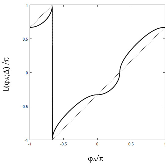 The coordinate transformation (20) as defined in (21) and (22) introduces the holonomy responsible for the time uncertainty mentioned above. This non-linear transformation generalizes the linear transformation assumed as an unavoidable must in the model of hidden variables discussed by Aerts et al. in [21]. In Figure 4, the transformation (20) is plotted against the linear transformation for the particular value for the sake of illustration. The maximum difference between the actual transformation and the linear transformation, which bounds the geometric phase that can be accumulated in a cycle, is roughly a of the period of the transformation, that is, ∼.