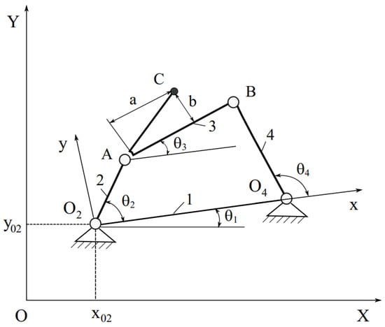 where , , , and denote the kinematic dimensions of links 1, 2, 3, and 4, respectively; a, b, , , and are shown in Figure 1; , , , are preventative for the angle positions of link 2 at input positions of coupler C, respectively.