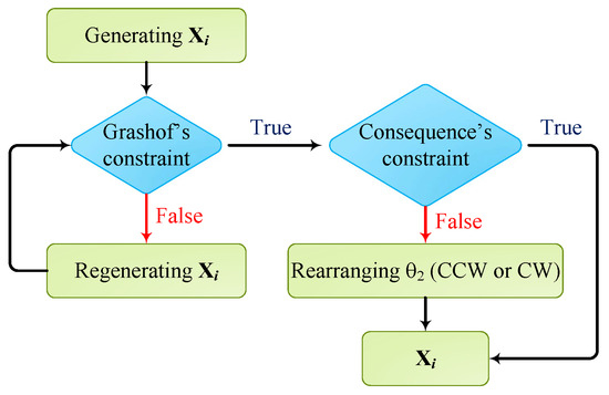 In the dimensional synthesis of four-bar mechanisms, the highly constrained objective function depends on the constraints related to Grashof’s condition and the sequences of input crank angles. Consequently, a random initialization stage might generate a small number of individuals that satisfy these above mentioned-constraints. Hence, the poor quality of the initial population might be generated. To tackle this problem, the refinement of the initialization is proposed in [2,8]. In this refinement, the first four variables related to the link lengths of the mechanism and crank angles of the input link are randomly chosen in the given range. Regarding the lengths, if they are not satisfied with Grashof’s condition, they are randomly generated until Grashof’s condition is true. For crank angles of the input link, if the consequential condition is false, these angles are rearranged counter-clockwise or clockwise. For example, in one problem, six input crank angles are needed and the vector of these values is generated as follows: . It shows that these crank angles violate the consequential condition. Thus this vector could be rearranged as follows: or . As a result, the initial population can provide much more feasible solutions for finding the optimal solutions. Concretely, this modified initialization is illustrated in Figure 2.