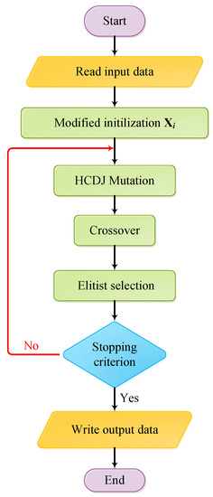 In the classical DE and Jaya algorithms, finding the next population is based on the comparison of the cost function values of the old and new individuals. Even though the worse individual is better than the others in the current population, some good individuals may be neglected, and thus the convergence rate and the accuracy of the solutions are not optimized yet so far. To improve this, an elitist selection [43] is used to choose the best individuals for the next iteration. Hence, the process of the HCDJ algorithm is shown in Figure 4.