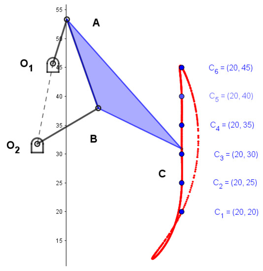 In this study, we focus on the dimensional synthesis of the four-bar mechanisms and the optimization problem, which is used to determine the kinematic dimensions of linkages and positions of pin-joints denoted by and (see Figure 1) by giving the input path of the coupler point C in link 3. and are set as target points indicated by the input point and the designed point, respectively, i.e., and . Therefore, the objective function can be written as follows [4]: