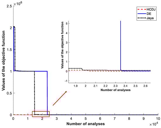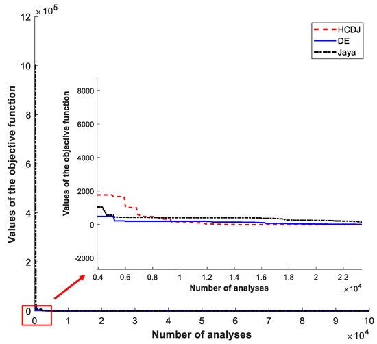 The convergence of objective values in Case 3 by using the DE, Jaya and HCDJ.