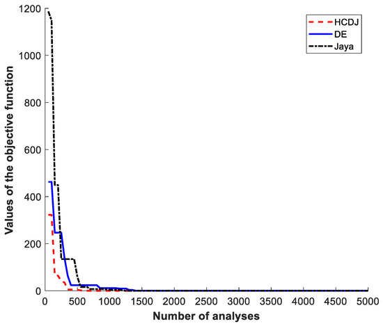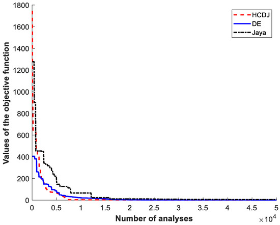Table 5 provides the optimal results obtained by HCDJ, and other approaches. It can be seen that HCDJ gives the best optimal solutions in all algorithms, for HCDJ. Additionally, Figure 5 shows the best path traced by the coupler in Case 1 by using HCDJ and there is a very good traced path of the point C. Additionally, the convergence rates of the HCDJ, DE, and Jaya are shown in Figure 6. The HCDJ reaches the optimal solutions faster than the DE and the Jaya.