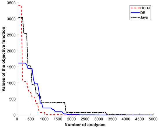 The convergence of objective values in Case 5 by using the DE, Jaya and HCDJ.