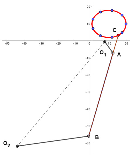 In the fifth case, an elliptical path generation problem without prescribed timing is investigated. The path consists of 10 target points. The elliptical path with a major axis of 20 units and a minor one of 16 units is considered. The center’s coordinate is at (10, 10) and the major axis is kept horizontal.