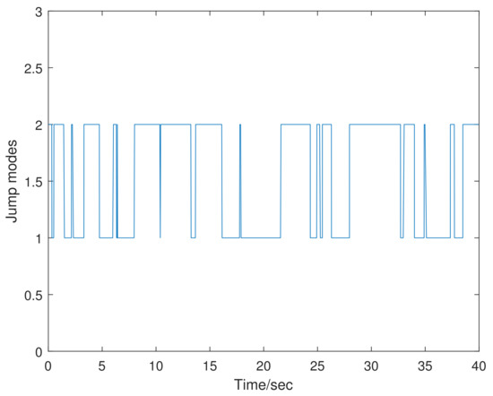 The actuator fault and sensor fault estimations using the proposed method are depicted in Figure 1 and Figure 2, respectively. Figure 3 and Figure 4 show the trajectories of the states and their estimation. One possible realization of the Markovian jumping mode is illustrated in Figure 5.