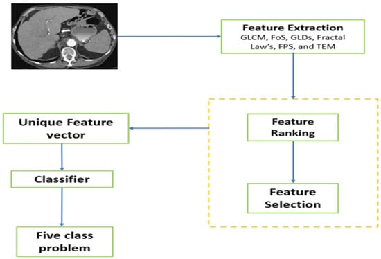 Feature extraction is a crucial step in any machine learning method, since it identifies essential details about the contents of an image. Different liver lesions show various distinct texture features or patterns; for example, different gray-level intensity patterns and values are shown by images with abnormal and normal conditions. Different models for acquiring texture features have been reported in the literature [31,32,33]. These models visualize the contents of an image in various ways. Some of these ways are textural details about the spatial distribution of pixel values and derivations from the level of brightness [19].