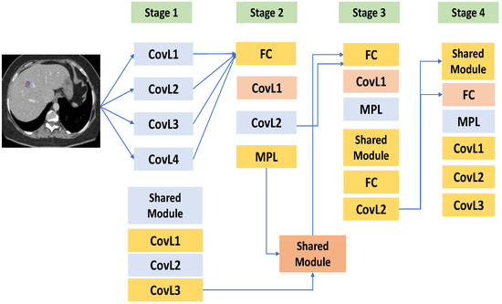 Our proposed network is shown in Figure 4. We used a feature extraction framework (FEF) to extract the features of healthy and affected livers. The various stages in Figure 5 show the main blocks of the feature-learning part. In Figure 5, stage 1 handles the feature variations. In CT images, there are scaling variations due to certain environmental factors. These receptive fields overcome all of these variations. As is made clear in Figure 5, each field has 16 filters. The output from the first stage is then given to stage 2, which is an FCL. In stage 2, we use a 2 × 2 MPL to extract features. The RLU then follows each CovL. Between the CovL and FCL, we placed a Spatial Pyramid (SPd). The SPd produces an output that is given to the FCL in stage 3. Stages 3 and 4, which are shown in Figure 5, take care of the feature extraction. Finally, the last stage, stage 4, an FCL, extracts the final features, which are then given to the next module for SS. Various parameters can be studied in Table 4 and Table 5.