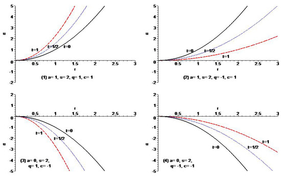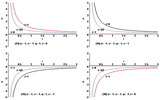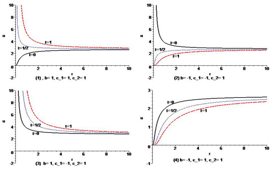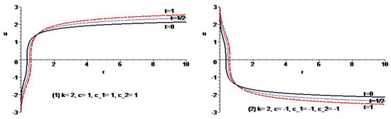 The solutions blow-up along the curves for the case of and extinguish along the curves for the case of , namely, the interface of the solution is the curve . Figure 1 shows the typical behavior of the governing equation for the case of and . The three curves are, respectively, corresponding to different times, and the vertical axis and the horizontal axis are, respectively, corresponding to u and r; this is the same as for the other Figures below.