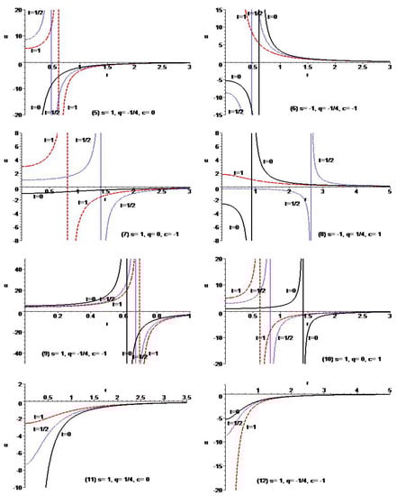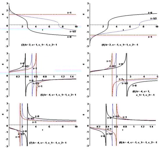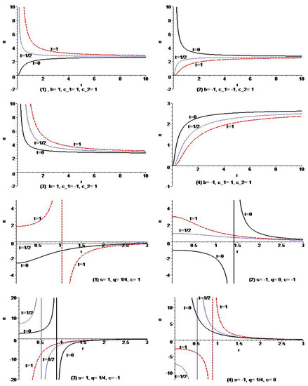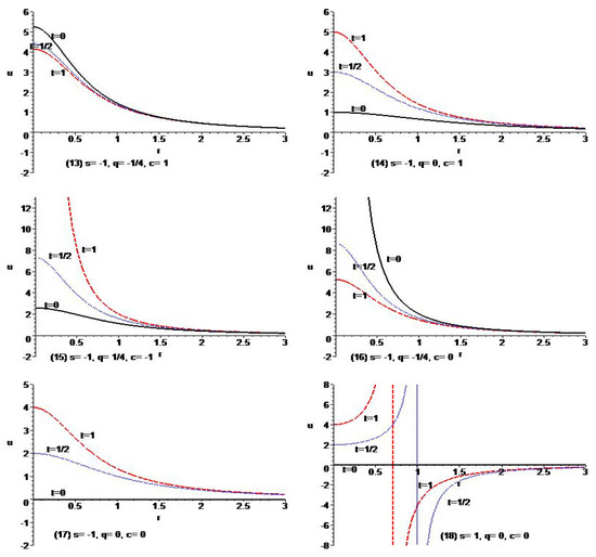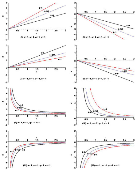 The compatibility of and the governing Equation (4) will yield exact solutions of the nonlinear diffusion Equation (4). To derive these solutions, one first solves the ordinary differential equation to determine the form of , and then substitutes the corresponding results into Equation (4) to finally identify the solutions. Here we just present several examples to illustrate the reduction procedure.