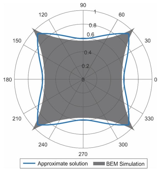 This equation determines implicitly the contact boundary , while is connected with through the condition (3). After substitution of into (6), the force will remain a function of the still undefined L, which should finally be found as a value giving the maximum to the force. All stated operations, beginning with the solution of Equation (12) with respect to , can be carried out analytically without approximations only in two cases: Either the above case of axisymmetric profiles (leading to the MDR) or in the case of linear (conical) profiles. The latter has already been done in the paper [5] for polygonal cross-sections. To be able to constructively realize the above program for more general shapes, let us consider profiles that only slightly deviate from axisymmetric ones. We will show below that this is the third case where a largely analytical treatment is possible.