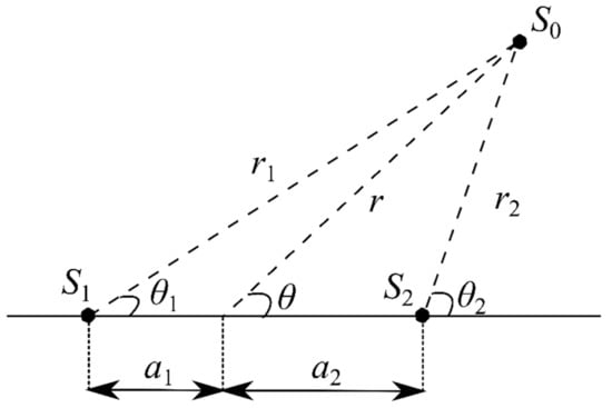 To formulate the solution for unsymmetrical doublet flow, we set the strength of source and sink as m1 and m2, respectively. For mathematical simplicity, the strength of source and sink can be re-expressed as in Equations (3) and (4), respectively: