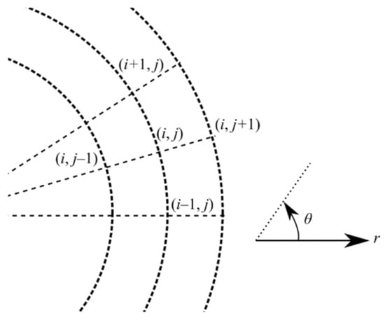 Since it is not straightforward to differentiate Equation (13), applying a simple finite differencing method can obtain the velocity vector. The discretised equations for Equations (14) and (15) are shown in Equations (16) and (17), respectively. The subscript i and j in Equations (16) and (17) represents the spatial coordinate at the θ and r component, respectively. The discretisation stencil for these notations is shown in Figure 2. Note that if the size of the stream function matrix is nx × ny, then the velocity vector matrix is reduced to (nx − 1) × (ny − 1).