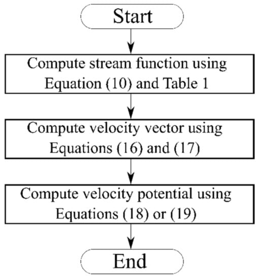 Perhaps, there are many numerical techniques to perform the integration over the velocity vector [42,43] as seen in Equation (18) or Equation (19). However, it is more convenient to obtain the velocity potential by considering the following Equations (5)–(10)