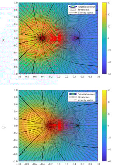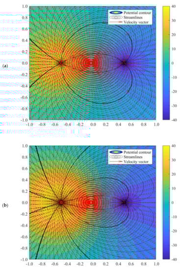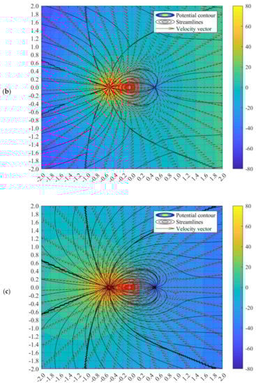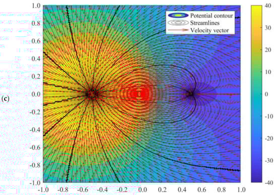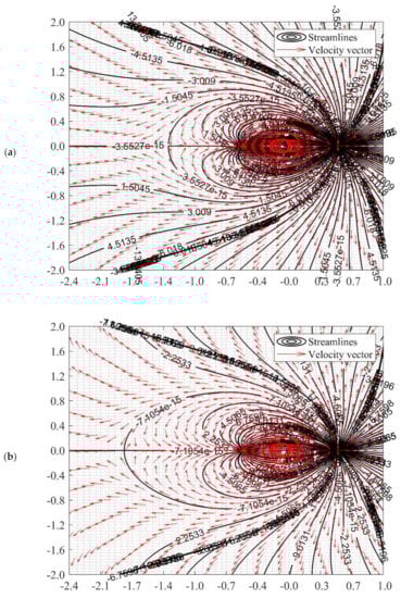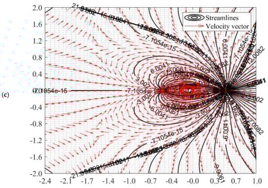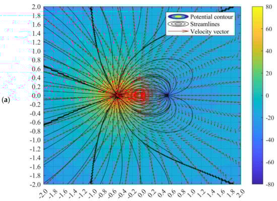The potential flow profile would be varied due to the distance of a1 and a2. The flow fields when a2 = 0.5 while a1 = 0.4 and 0.2 can be illustrated as in Figure 6. Perhaps, there is no difference in flow characteristics between the doublet flow of different a1 and a2 values with identical a1 and a2 values, as long as the summation of a1 and a2 is the same. For instance, the value of b remains unchanged when a2 = 0.5 and a1 = 0.2, and when a1 = 0.35 and a2 = 0.35, in accordance with Equation (27). Nonetheless, manipulating the value of a1 and a2 is beneficial in setting up the precise location of the sink and source. This advantage would assist in simulation doublet flow-related studies such as geothermal creeping flow and other environmental Darcy flow.