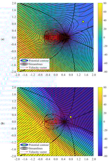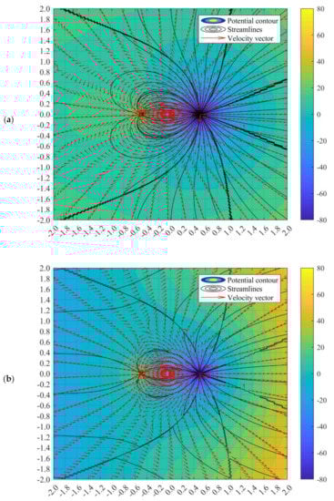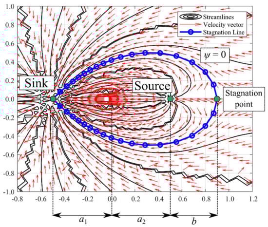 From Figure 5, it can be observed that when the strength of the sink and source is not identical, both the streamlines and potential lines are distorted. The more significant the difference between the sink and source, the more apparent the distortion is. When the strength of the sink is 3, the flow pattern is almost similar to the doublet flow with identical source/sink strength. However, when the strength of the sink increased, the deviation of velocity field could be observed, in which the velocity vector was altered with a stiffer angle moving towards the sink. It is an interesting phenomenon that a stagnation point can be observed at a larger sink strength, i.e., 5. This stagnation point exists as the sink with superior strength could act as a “uniform flow” moving towards the sink, countering the flow from the source. The distance of the stagnation point (see Figure 5), b, can be predicted by equating the velocity for source and sink such that: