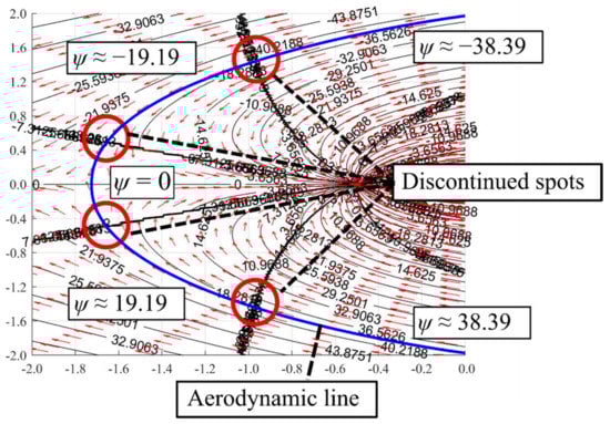 The continuity of the stagnation line (ψ = 0) is broken due to the discontinued spot, as shown in Figure 8. The discontinued spot is formed due to the dominance of the sink, which deviates and realigns the streamlines around the sink’s domain. However, it is still possible to obtain the aerodynamic line that forms a flow structure that resembles Rankine-oval or half body structure. It is not straightforward to determine the aerodynamic line for the sink-dominant superposed flow as there is a discontinued stream function along the stagnation line. For example, in Figure 7d, at 163° ≤ θ ≤ 180°, a non-zero stream function can be observed (see Figure 8 for a detailed illustration). The point which separates the zero and non-zero stagnation stream function is named as the discontinued point in this paper. Thus, the first pair of discontinued points can be observed at (0.5, −1.65) and (−0.5, −1.65), in which the stagnation stream function changes from ψ = 0 to ψ ≈ ±19.19. Meanwhile, at 124° ≤ θ ≤ 163°, the stagnation stream function changes again from ψ ≈ ±19.19 to ψ ≈ ±38.39, in which the discontinued spots are located approximately at (1.4, −0.95) and (−1.4, −0.95). Due to this complication raised by the discontinued spots, the aerodynamic line can only be approximated with graphical visualisation.