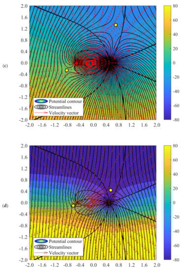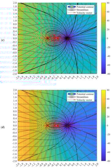 Moreover, it is noteworthy that at an extremely high far-field velocity from the source-sided direction, a secondary stagnation point can be observed at the wake of the sink. For instance, in Figure 7d, the secondary stagnation point is located approximately (−1.7, 0). The flow structure resembles the half-body flow. In the half-body flow, the stagnation line forms due to the intersection between the far-field flow and the source. In the current case, the current half-body flow forms from the imposition of significantly powerful far-field velocity and sink-dominated doublet flow. The greater the far-field speed from the source-sided direction, the larger the distance between the secondary stagnation point and the sink.