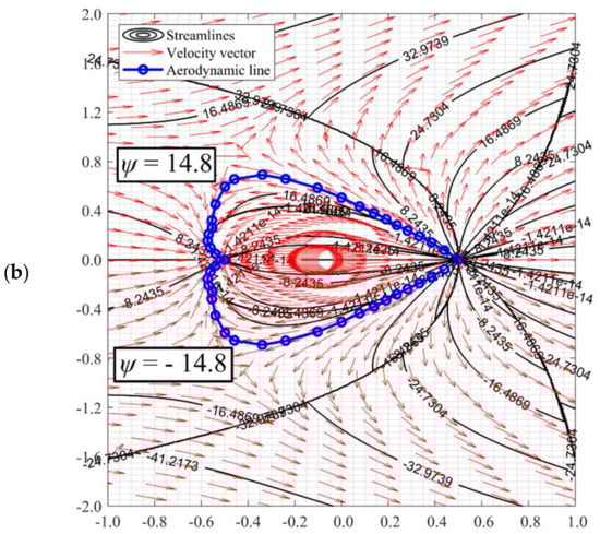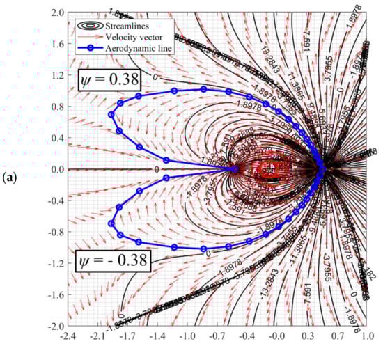 However, when the far-field velocity is beyond the range as stipulated in Equations (31) and (33), with increasing far-field velocity, the stagnation point and stagnation line will gradually grow further and larger before disappearing. The streamline evolution due to the increasing far-field velocity can be referred to in Figure 10. At a low far-field velocity where the stagnation point exists, the stagnation line can be obtained at ψ = 0. A detailed graphical method is required to approximate the aerodynamic line that bounds the doublet domain at a higher far-field velocity where the stagnation point has perished. The graphical numerical approach is required as the value of the aerodynamic line stream function could be non-zero, and the value of the stream function has to be approximated under a high-resolution stream function plot. For example, the stream function of the aerodynamic line of Figure 9a,b is about ±0.38 and ±14.8, respectively. With the graphical method as delineated in Section 3.1, the coordinates of the stagnation line of Figure 9a,b can be plotted as Figure 11.