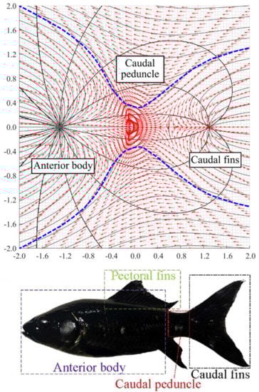 It is possible to relate the potential flow of doublet boundaries with the 3D morphological structure of animals, which would assist the future design in unmanned aerial/underwater vehicles. For example, by taking a1 = a2 = 1.3, while the strength of the source and sink is 2 and 7, respectively, at U = 50 and θ = 180°, an aerodynamic line resembling a Carangiform swimmer’s caudal peduncle [54,61] could be formed, as illustrated in Figure 13. The source and sink can be perceived as the centre of the rear of the anterior body and caudal fin, respectively. With the user-defined parameters as aforementioned, the aerodynamic line which connects the anterior body and caudal fin can be formed. Then, with some interpolation tools such as the moving least squares method, the geometry of the aerodynamic line can be obtained. A geometry built upon the aerodynamic line could theoretically ensure a smooth flow and thus improve swimming efficiency.