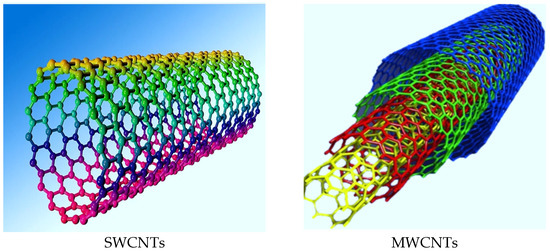 Nanofluids set up by blending nanoparticles (10–50 nm) to base fluid [8] were recently used in energy and biomedical applications (nano-drug delivery and cancer therapeutics) [9]. Nanofluids are used to significantly increase heat transfer properties in industries’ cooling applications, nuclear reactors and electronics. In 1991, Lijima and Lchihashi [10] discovered carbon nanotubes (CNTs). CNTs are hexagonally formed arrangements of carbon particles that have been transformed into tubes. CNTs with an undetermined carbon-wall structure and diameter less than 100 nm were discovered by Radushkevich and Lukyanavich [11]. The thermal conductivity of CNTs is high with exceptional corrosion resistance and exceptional mechanical strength. The novel properties of CNTs make them valuable in applications such as nanotube radars, nanotube transistors, microwave amplifiers, solar cells and handheld X-rays. CNTs are divided into two categories explicitly, as is shown in Figure 1, the single-wall carbon nanotubes (SWCNTs) and multi-wall carbon nanotubes (MWCNTs). Chio et al. [12] analyzed an uncharacteristic thermal conductivity boost in the CNTs. Homogenous CNT composites for electrical application are studied by Ramasubramaniam et al. [13]. Ellahi et al. [14] studied the natural convective boundary layer flow of nanofluids with SWCNTs and MWCNTs. Magnetohydrodynamics nanofluid hydrothermal behavior in a cubic cavity heated from below is presented by Sheikholeslami and Ellahi [15]. Haq et al. [16] studied the MHD pulsatile flow of engine-oil-based CNTs between two concentric cylinders. Ding et al. [17] inspected the heat transmission analysis of aqueous suspensions for CNTs. The investigation of SWCNTs and MWCNTs with kerosene oil and water as base fluids and the thermos-physical properties of CNTs in terms of the solid volume fraction used through empirical correlation is reported by Tiwari et al. [18]. Nadeem et al. [19] investigated the convective heat transfers in MHD slip flow over a stretching surface in the presence of CNTs; they found that the heat transfer rate and skin fraction for engine-oil-based CNTs are higher than water-based CNTs. Nasiri et al. [20] have shown that the CNTs’ structure and stability are strongly dependent on the functionalization and preparation method of the nano-suspension. In conjugate heat transference in a quadrilateral porous cavity heated diagonally and loaded up with nanofluids contemplated by Chamkha and Ismael [21], the problem was interrogated numerically by using the Over Successive Relaxation (OSR) finite-difference method. Carbon nanotubes with water-based nanofluid were observed in vertical truncated cones under the consideration of the first and second levels of truncation by Ellahi et al. [22]. Authors claimed that heat transfer in cones rapidly improved as the concentration of nanoparticles, half-cone angle and wavelength ratio enhanced gradually. Heat production or immersion results depending on temperature are assumed and reported by Vajravelu and Hadjinicolaou [23], Chamkha [24], Sparrow and Cess [25], Vajravelu and Nayfeh [26] and Ellahi et al. [27]. Enhanced thermal conductivity in multi-walled carbon nanotubes (MWCNTs) with two different base fluids, ethylene glycol and engine-oil nanofluids is observed by Liu et al. [28] under the influence of nanoparticle concentration. They noted that the thermal conductivity of the engine oil MWCNT nanofluid improved up to 30% with a 2% nanoparticle concentration, as compared to the thermal conductivity of ethylene glycol MWCNT nanofluid at 12.4% with a 1% nanoparticle concentration. Carbon nanotubes (SWCNTs or MWCNTs) are used as particle material due to their high thermal conductivity properties.