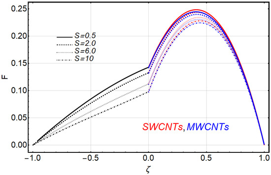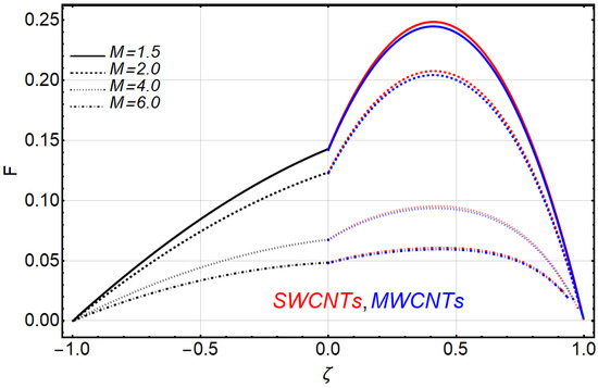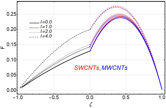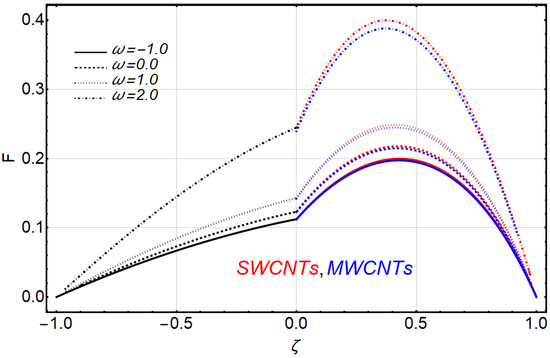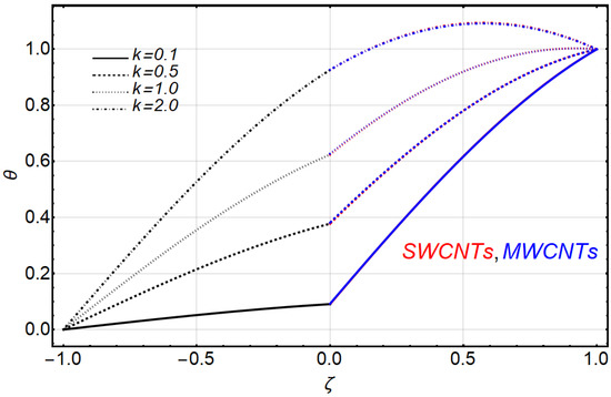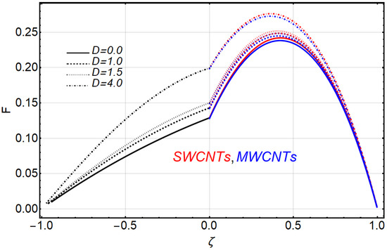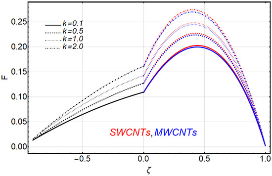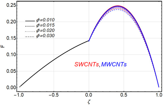 The influence of the nanoparticle volumetric fraction is depicted for both nanofluids and without nanofluid in Figure 15 and Figure 16 for the velocity and temperature distributions, respectively. In both figures near the interface of the second without-nanofluid region due to the interface conditions, a slight change occurs in velocity and temperature. It is noted that the nanoparticles disturbed fluid-2 due to their physical properties. In Figure 15, the velocity field gets affected by the nanoparticle’s volume fraction, and the momentum boundary layer of nanofluid slows down as the concentration of particles increases. It is also noted that the velocity in engine-oil SWCNTs is higher than that of engine-oil MWCNTs. Moreover, the temperature of nanofluid in first region is enhanced as the concentration of nanoparticles increases. The thermal boundary layer thickness of engine-oil SWCNTs as compared to engine-oil MWCNTs enhanced gradually as the nanoparticle concentration increased, as shown in Figure 16.