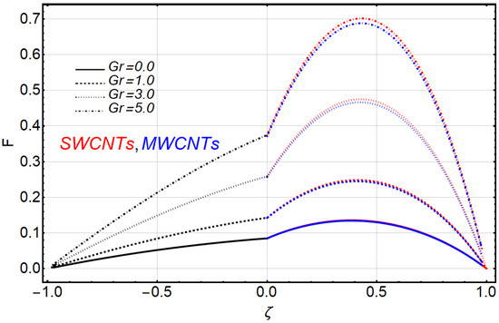 The above investigation of the fluid flow of CNTs through porous media is solved analytically. The results of velocity and temperature in Figure 3, Figure 4, Figure 5, Figure 6, Figure 7, Figure 8, Figure 9, Figure 10, Figure 11, Figure 12, Figure 13 and Figure 14 are presented graphically for fluid-1 (engine-oil-based CNTs nanofluid) and fluid-2 (water) with the various values of different parameters, such as the Hartman number , Grashof number , Electrical conductivities ratio , dynamic viscosities ratio , region heights ratio , thermal conductivities ratio and heat generation/absorption . Additionally, the comparison between the single-wall (SWCNTs) and multiple-wall carbon nanotubes (MWCNTs) is displayed in each figure. The said figures for the velocity and temperature distribution are formed against the different values of each parameter by keeping the rest of them taken as and Figure 3 and Figure 4 show the velocity profile for both fluids (water- and engine-oil-based CNT nanofluid) against different values of and , respectively. The inverse relation is noted between velocity and the Hartman number in Figure 3 because the magnetic field provides the Lorentz force which resists the fluid flow in the channel. In the nanofluid region, the velocity of engine-oil MWCNTs reduces as compared to the velocity of engine-oil SWCNTs, as the Hartman number is going to be large. In Figure 4, flow movement is inversely affected for positive values of in both fluids, while it has substantial electrical conductivity but is more affected in the presence of the magnetic field. The impact of and on the velocity profile are reported in Figure 5 and Figure 6, respectively. The fluid is flowing only due to the pressure gradient when , and for the case of buoyancy effects complicate the governing problem because the velocity and energy equations are converted in coupled form. Physically, the presence of the thermal buoyancy currents induces more flow in the channel which is taking place through the application of a pressure gradient. So, in both nanofluid and without nanofluid regions, the flow of fluid increases as the values of the Grashof number gradually increases, as shown in Figure 5. Similar increasing results are noted from Figure 6 for in the water region and nanofluid region. The velocity of engine-oil SWCNTs boosts up rapidly as compared to the velocity of engine-oil MWCNTs for increasing values of the viscosity ratio. In Figure 7, the influence of the inverse Darcy number on velocity is explained. In the said figure, as estimated with the increase of the inverse Darcy number, the velocity decreases because a higher inverse Darcy number leads to a lower permeability of the medium, and with lower permeability, the nanofluid cannot move easily in between the walls. The performance of the inertia coefficient of the porous medium or non-Darcy (Forchheimer) number on velocity is shown in Figure 8. It is detected that larger values of inertia coefficient of porous medium lead to a weaker momentum boundary layer thickness and stronger thermal boundary layer. The impact of the height ratio is portrayed for both nanofluids and without nanofluid in Figure 9 and Figure 10 for the flow and heat profile, respectively. Almost symmetrical results are noted in both figures for increasing values of the height ratio regarding the interface in the vertical channel. Velocity and temperature in nanofluid regions accelerated quickly for values of in engine-oil SWCNTs compared to engine-oil MWCNTs. The influence of thermal conductivity ratio for the velocity and temperature distribution of fluid-1 and fluid-2 in the system has been exhibited in Figure 11 and Figure 12. This indicates that the increasing values of cause an enlargement in the value of velocity and temperature for greater values . Velocity in Figure 9 for engine-oil SWCNTs and engine-oil MWCNTs gives the maximum amplitude at the center of the nanofluid region and decreases at the vicinity of the right wall for the value of . The temperature profile in Figure 12 is almost linear for small values of and becomes non-linear for large values of . Figure 13 and Figure 14 identify the outcome of heat source/sink for fluid flow and energy analysis, respectively. In the case of mean, there is no heat source/sink or heat generation/absorption for energy transform phenomena. It is noticed that the thermal boundary layer generates energy when , and in response, the temperature field boosts up in both nanofluid and without nanofluid. However, for the case of , boundary energy is absorbed; therefore, the resulting temperature drops and falls down quickly for decreasing values of .