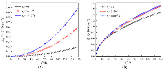 The dependency of the wave velocity and the attenuation coefficient of body waves on the relaxation time and frequency are depicted in Figure 5 and Figure 6. The frequency ranged from 0.01 Hz to 150 Hz therein. The relaxation time associated with the flow-independent viscosity was taken to be 0 s, 5 × 10−4 s, and 1 × 10−3 s, respectively.