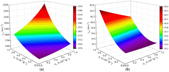 The relationships of thermal expansion coefficients of solid particle and pore fluid and the wave velocity and attenuation coefficient of body waves are portrayed in Figure 7 and Figure 8 when s. The thermal expansion coefficients of solid particle and pore fluid all ranged from 0.0 K−1 to 1.0 × 10−3 K−1. The enlargement of the thermal expansion coefficient of solid particle was accompanied by the increase of both wave velocity and the attenuation coefficient for the P1 wave, whereas the augmentation of the thermal expansion coefficient of pore fluid was accompanied by the increase of wave velocity and the decrease of the attenuation coefficient for the P1 wave, as depicted in Figure 7a and Figure 8a. Meanwhile, a diminution of the thermal expansion coefficient of the solid particle resulted in a negative growth of wave velocity and a positive growth of the attenuation coefficient for the P2 wave, whereas the influence of the thermal expansion coefficient of pore fluid on the P2 wave was quite contrary, as displayed in Figure 7b and Figure 8b.