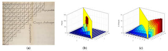 Classical (discrete) Pascal’s triangle: (a) Original Blaise Pascal’s writing, (b) 3D bar graph of , and (c) 3D bar graph of .
