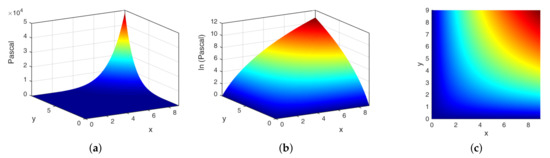 Let be a Cartesian coordinate system. Starting from the original Pascal’s triangle depicted in Figure 1a, one should consider the infinite triangle corresponding to . Obviously, we can write the numerical entries of this triangle in the lattice points (i.e., points with integer coordinates) from the first quadrant of the Cartesian coordinate system . In particular, this maps the components onto the lattice points , where are positive integers. Here represent both indices in the matrix (hence, starting from 1), as well as the integer coordinates in the Cartesian coordinate system. Since we may form the triple , which corresponds to a particular point in space. In Figure 1b, we have the graphical representation of the points , where To interpolate in between the points , a continuous smooth surface is needed, which can be obtained by simply replacing with its continuous version .