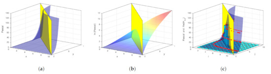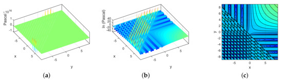 Pascal’s Surface for : (a) Linear view (large oscillations), (b) Logarithmic view, and (c) Contours of Figure 7b.