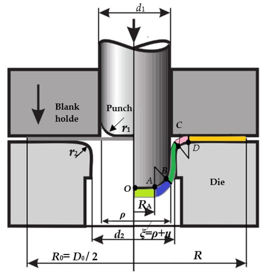 A cylindrical part is one of the typical axisymmetric parts, such as drawing dies. A drawing die consists of a punch, a die, and a blank holder, as shown in Figure 1. In the drawing die, blanking clearance is slightly greater than the blank thickness, which results in a nonstraight wall of the part’s sidewall. Therefore, the cylindrical symmetrical part can be treated as a conical part with a small taper. According to the stress and strain distribution of deep axis-symmetric drawing, the deformation area is divided into several parts []: barrel bottom area (zone 1-lime): , punch fillet area (zone 2-blue): , sidewall area (zone 3-green): , punch fillet area (zone 4-rose): and flange area (zone 5-gold): .