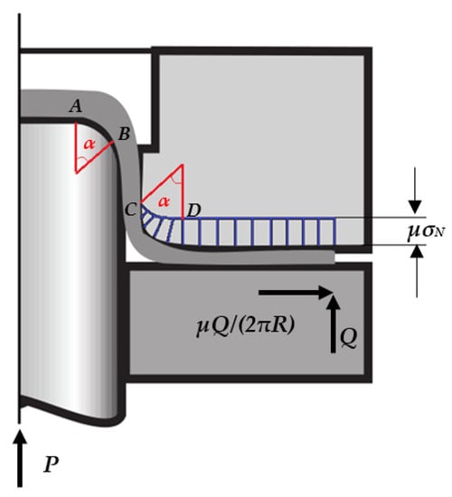 There is contact friction between the workpiece and the blank holder, punch and die in zone 4 and zone 5 for drawing symmetric cylindrical parts. In previous studies, the friction of the flange part used to be simplified as the contact friction between the flange part and the die surface, and only the friction caused by blank holder force was considered []. There is friction on the outer periphery of the flange, i.e., the single-sided friction on the unit arc length. In the analysis of die fillet, the Euler formula is often used as an approximation. Hence, a simplified model is shown in Figure 2. Friction in the upper surfaces in zones 4 and 5 are considered based on the perspective of the axial external force balance of the workpiece.