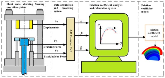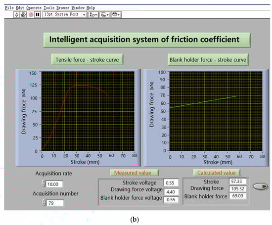 With the material parameters, the friction coefficient measurement principle (see Figure 3). The calculated friction model is imported into the finite element software for simulation analysis, so as to improve simulation accuracy. The friction coefficient is measured using a self-developed punching system and equipment (see Figure 4a). It is lubricated with butter, which is evenly applied on the surface of the sheet. The diameter of blank T = 140 mm; punch diameter d = 70 mm; die diameter D = 71 mm; punch fillet radius r = 10 mm; die fillet radius R = 6 mm. According to the nonlinear friction coefficient algorithm of symmetrical plate deduced above, the relevant tensile test data, and input the values of tensile force (P), stroke (H) and blank holder force (Q) of each test, the friction coefficient is calculated. The collected data are input into the programmed MATLAB program to obtain the friction coefficient of sheet metal stamping. Taking the performance parameters of each experimental plate, the friction coefficient under the given conditions is calculated. Three experiments for each group were undertaken, and the average value calculated. The drawing force and punch depth curve is calculated with the known material performance parameters and die geometric parameters. The calculation results of the friction coefficient of each plate are shown in Figure 4b. The relationship curve between drawing force and stamping depth is shown in Figure 5. The friction coefficient and punch depth curve is shown in Figure 6.