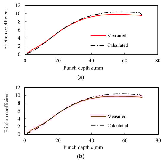 The friction coefficient can be calculated when the data and plate parameters are known. The theoretical drawing force–stroke curve calculated by the analytical formula (15) and (16) is fitted with the measured drawing force–stroke curve. According to references [], the drawing friction coefficient can be expressed as: