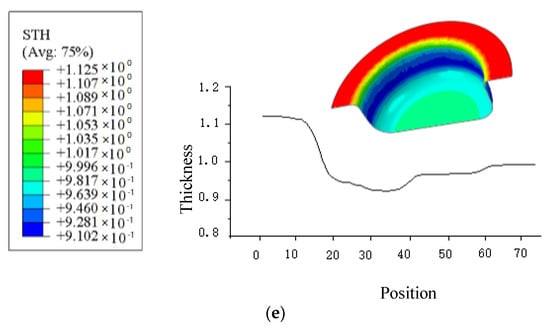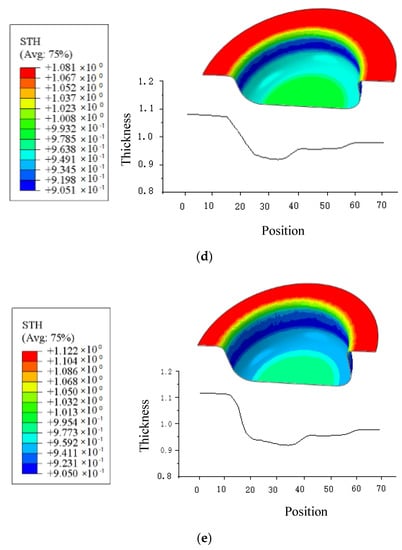 Wall thickness location points and wall thickness distribution under constant friction coefficient (μ = 0.2); (a) h1 = 10 mm; (b) h2 = 15 mm; (c) h3 = 20 mm (d) h4 = 25 mm; (e) h5 = 30 mm.