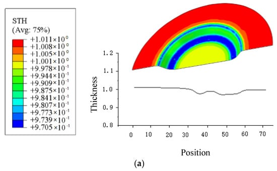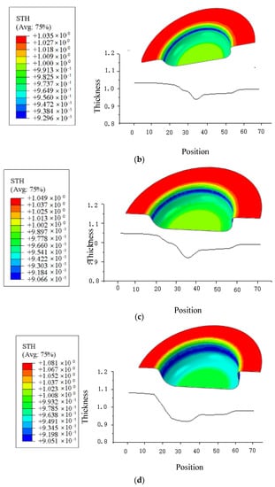 Under a blank holder force of 2.0 MPa, using the friction coefficient model with a constant friction coefficient (μ = 0.2), finite element simulation and analysis of the wall thickness are carried out. The simulation results are compared to the experimental results as shown in Figure 9 and Figure 10. It shows the wall thickness distribution at other parts of the cylinder wall at different drawing heights for μ = 0.2 and the friction coefficient model. It shows that the thickness changes with the drawing. The flange part becomes thicker and the fillets of die and punch become thinner. The fillet of punch is the worst part. When the stroke increases, the bottom area becomes thinner.