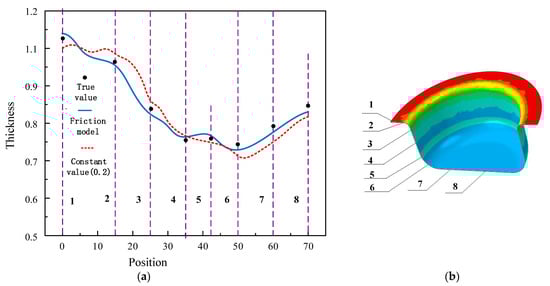 To compare the variation of the measured thickness of the parts, the wall thickness at eight position points (see Figure 11) in five different cylinder areas is taken for the measurement. The simulated and measured wall thickness are shown in Table 4. For the variation law of part wall thickness, the thickness of the friction model is closer to the actual value. It shows: