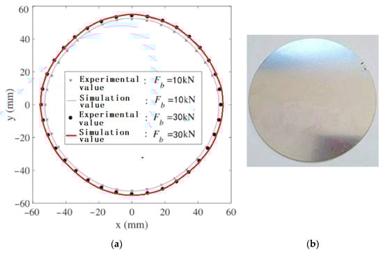 Using the friction model, the blank shape is simulated and measured experimentally when the blank holder force is 10 kN and 30 KN, respectively. The blank shapes are compared, and the error is less than 5%. The comparison results show that the simulation and measurement results have a good agreement, as shown in Figure 12. The actual deep drawing of aluminum alloy and the cylinder after deep drawing in the verification experiment are shown in Figure 13.